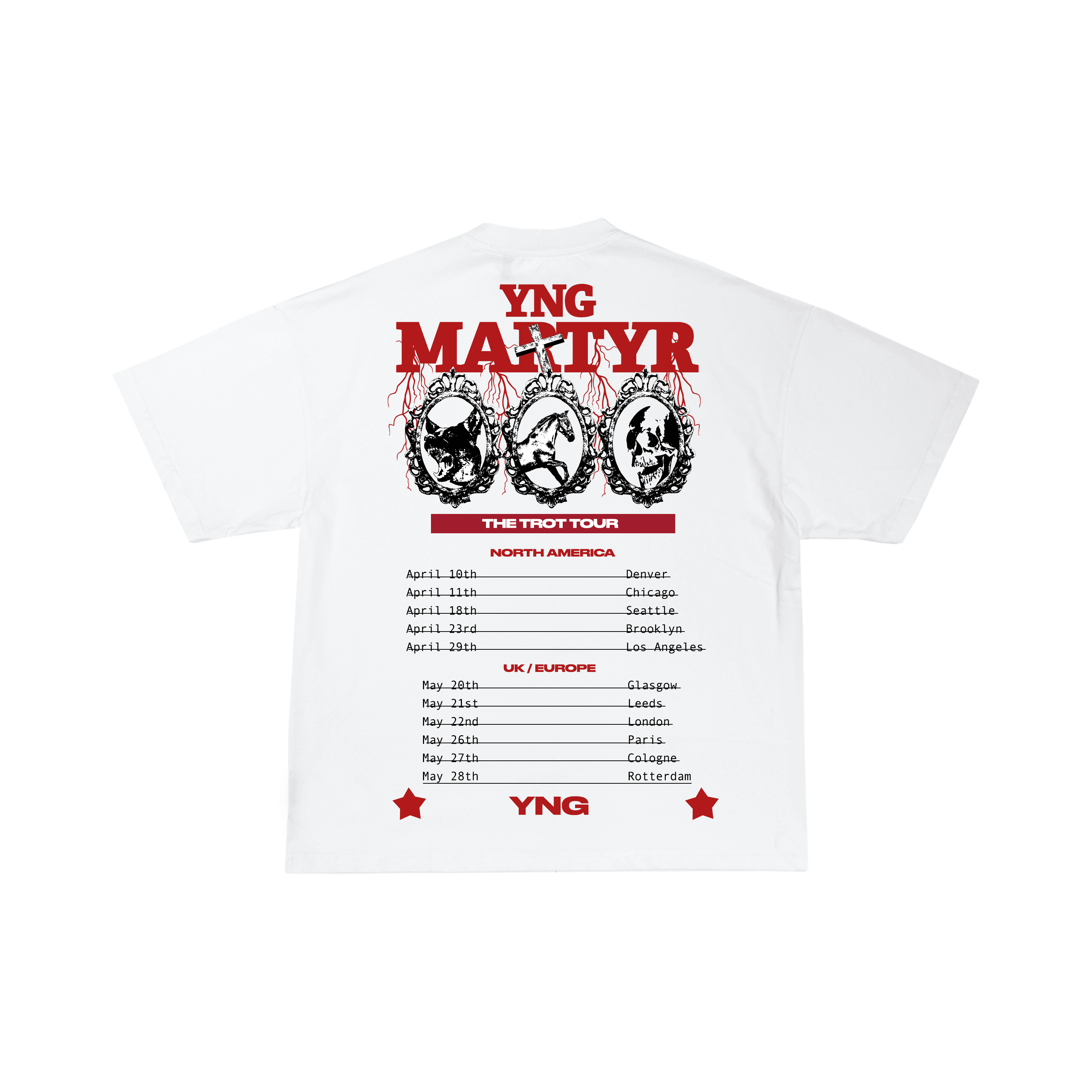 I was tasked with designing the official merchandise for YNG Martyr’s “The Trot Tour” across North America and Europe, creating a range of tees and hoodies using Photoshop and Illustrator. The designs included both exclusive tour-specific items and general merchandise. With a tight deadline due to the tour’s impending launch, I managed multiple revisions and rounds of client feedback. Despite the time constraints, I successfully delivered a polished, high-impact collection that aligned with the artist’s vision, demonstrating my ability to produce quality work under pressure for a major international client.
